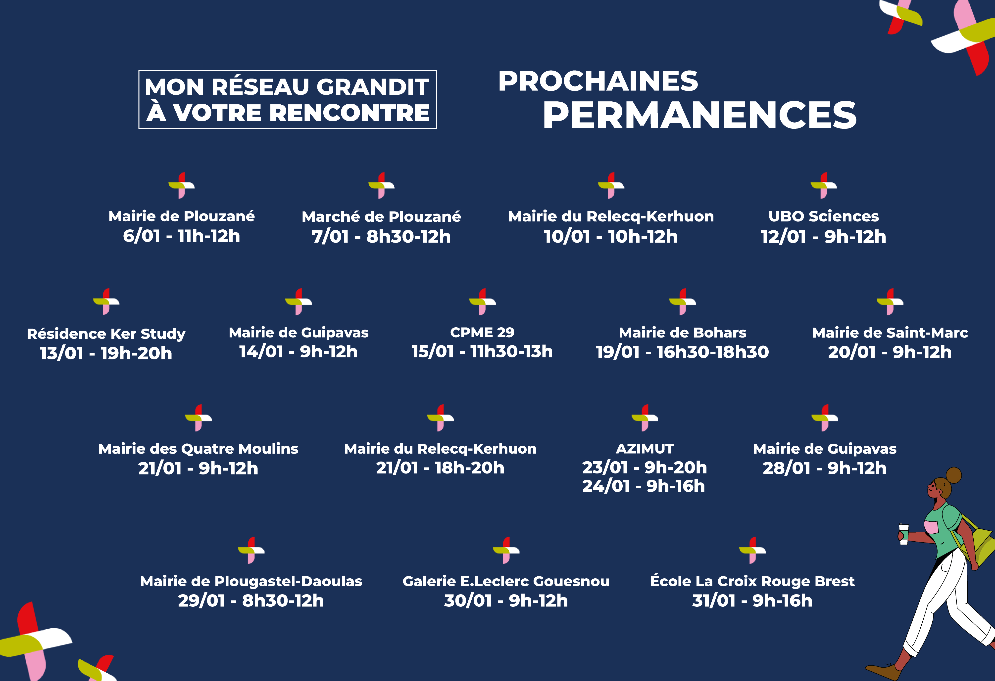Pour vous accompagner au mieux dans cette transition, des permanences sont organisées dans les mairies des communes et quartiers de Brest métropole, mais aussi dans les écoles, les centres commerciaux, les marchés, etc.