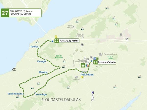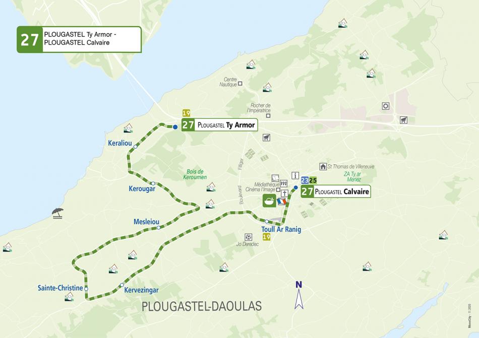 Inspirée de la « ligne des serres » créée pendant la première phase de confinement de 2020 pour les salariés des serristes de Plougastel, la ligne 27 réalise un aller le matin depuis l’arrêt Ty Armor à 7h24 et un retour le soir depuis l’arrêt Calvaire à 16h00.