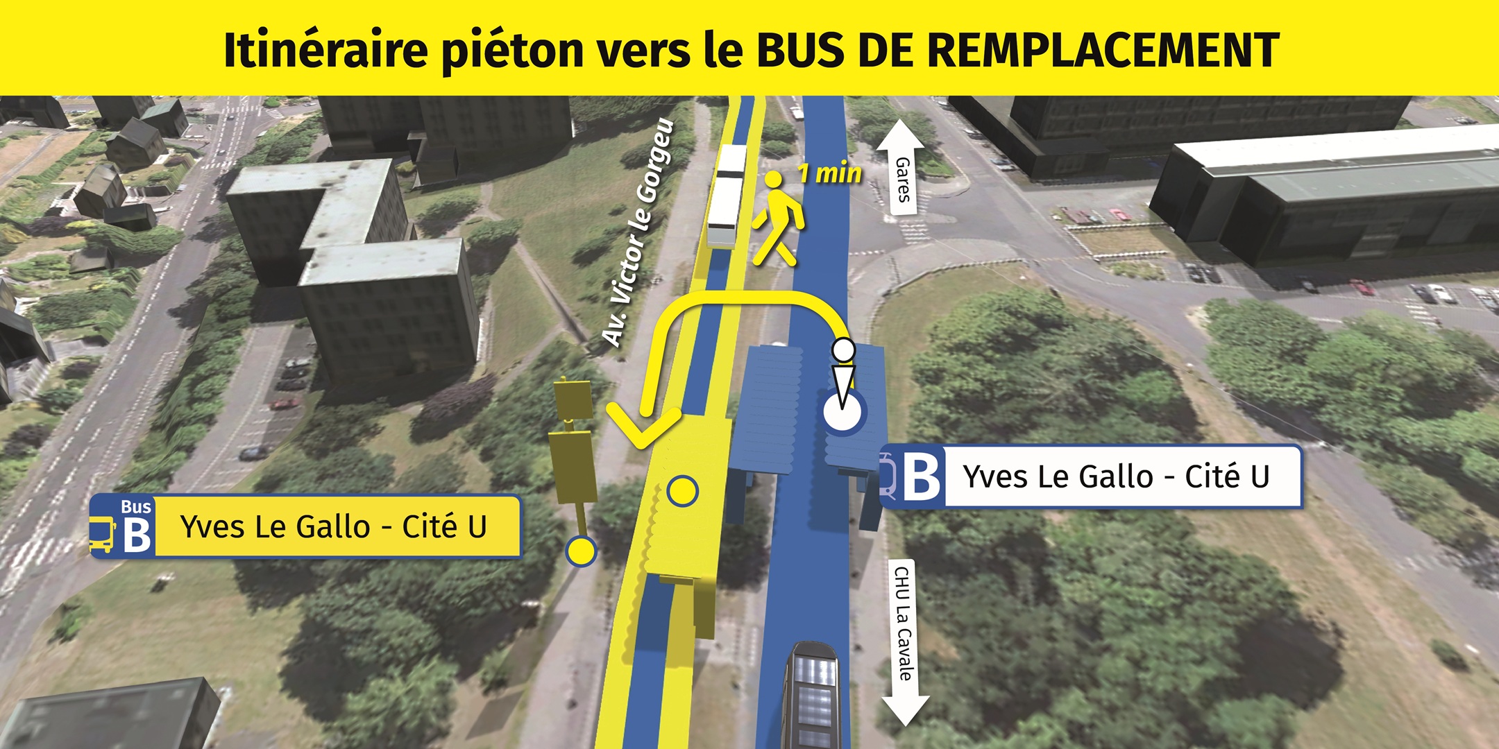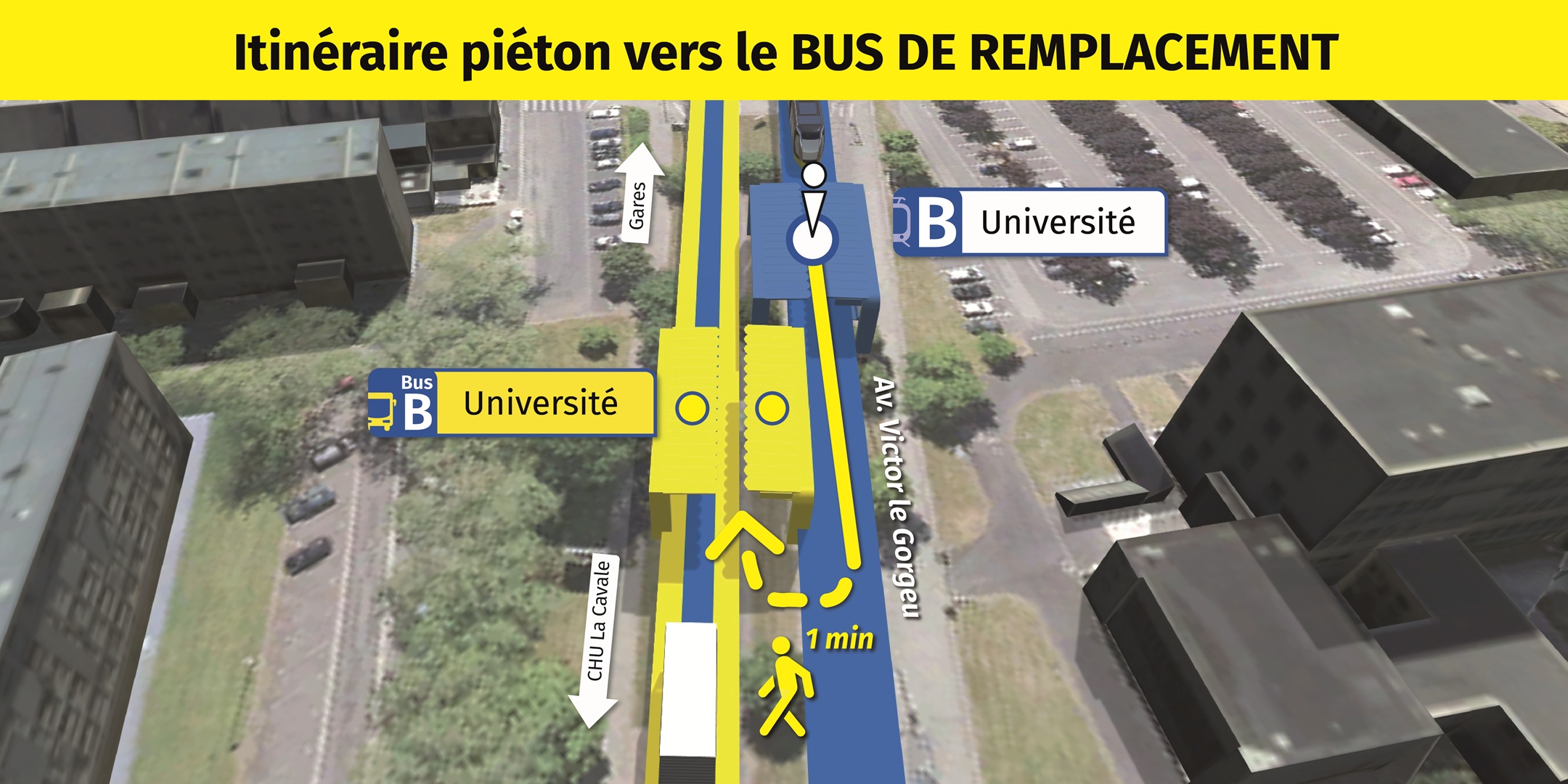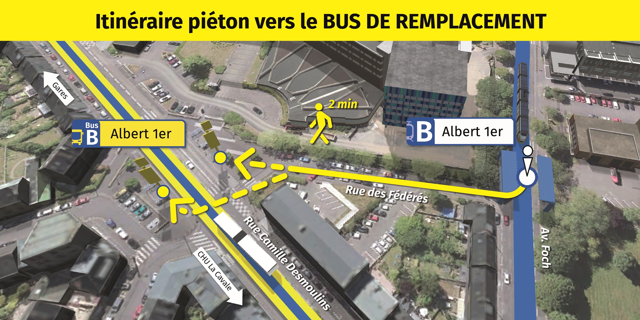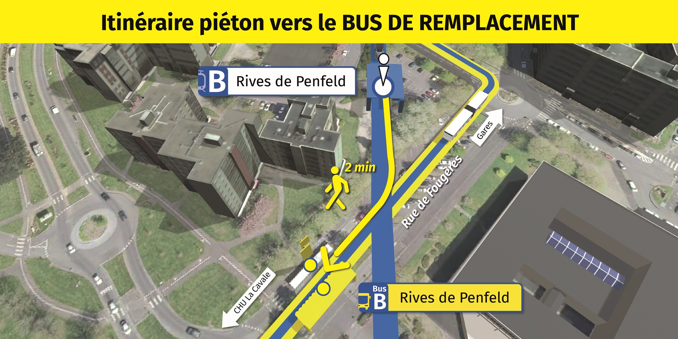 Visualisez ci-dessous, l'emplacement des arrêts de bus de remplacement et le cheminement piéton pour vous y rendre.