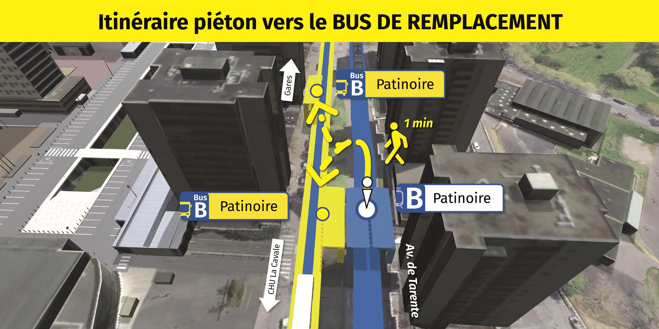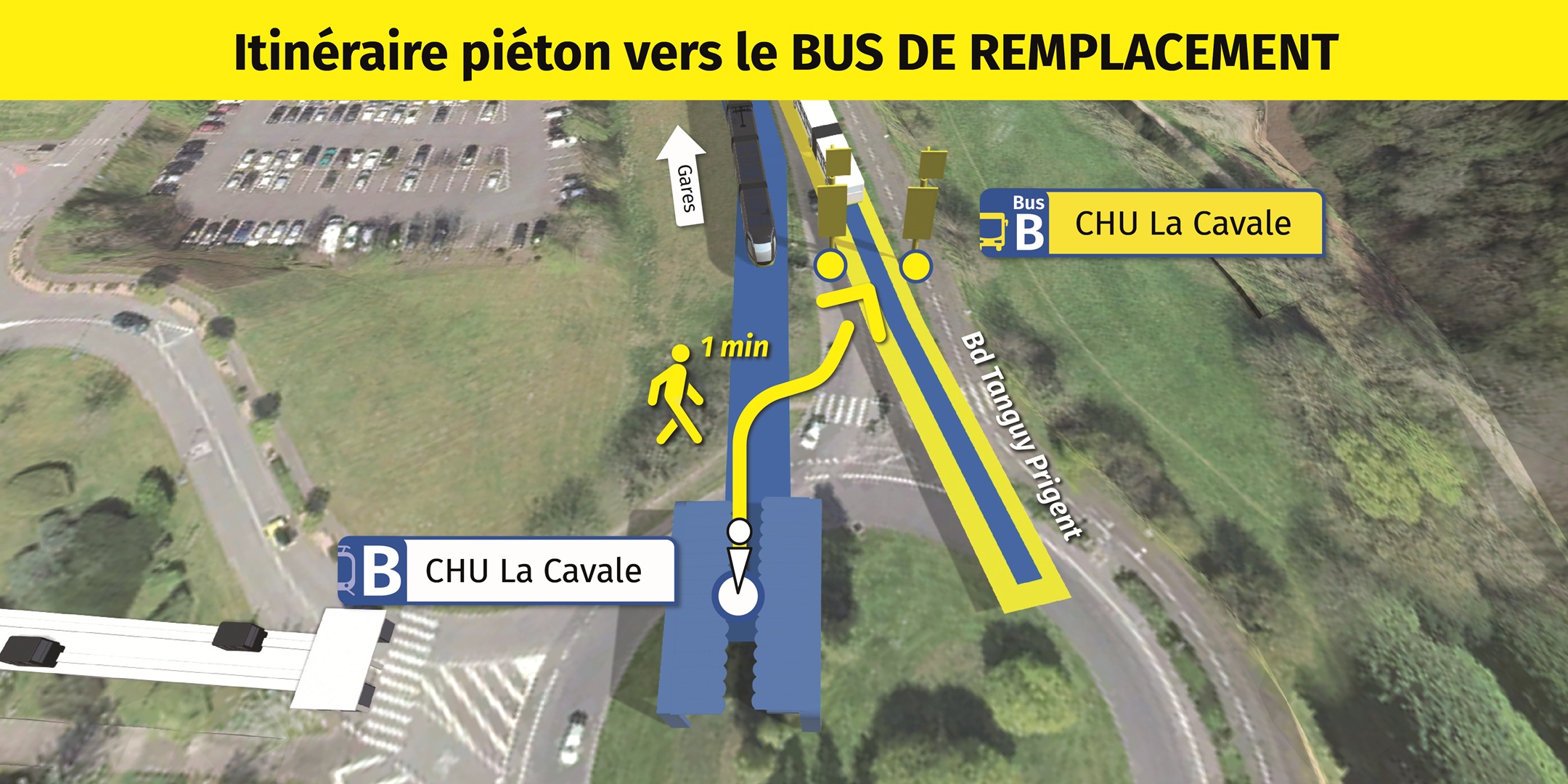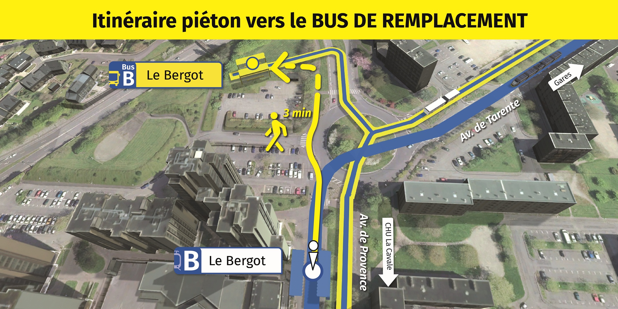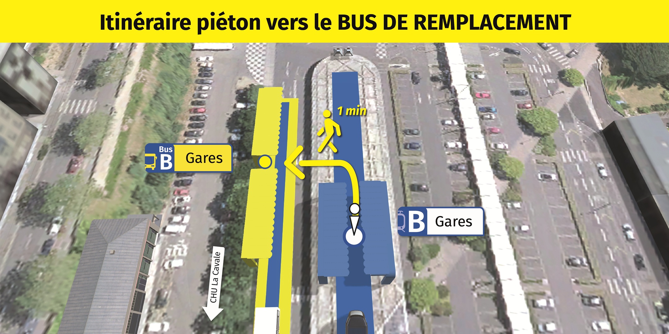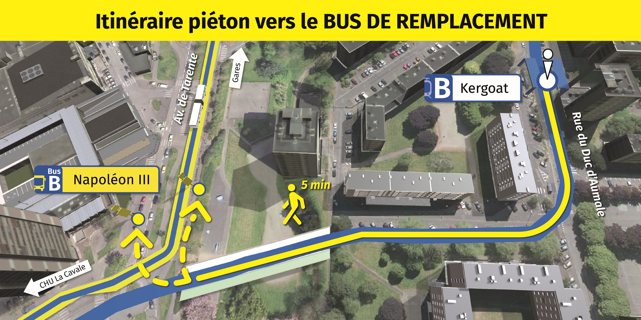 Visualisez ci-dessous, l'emplacement des arrêts de bus de remplacement et le cheminement piéton pour vous y rendre.