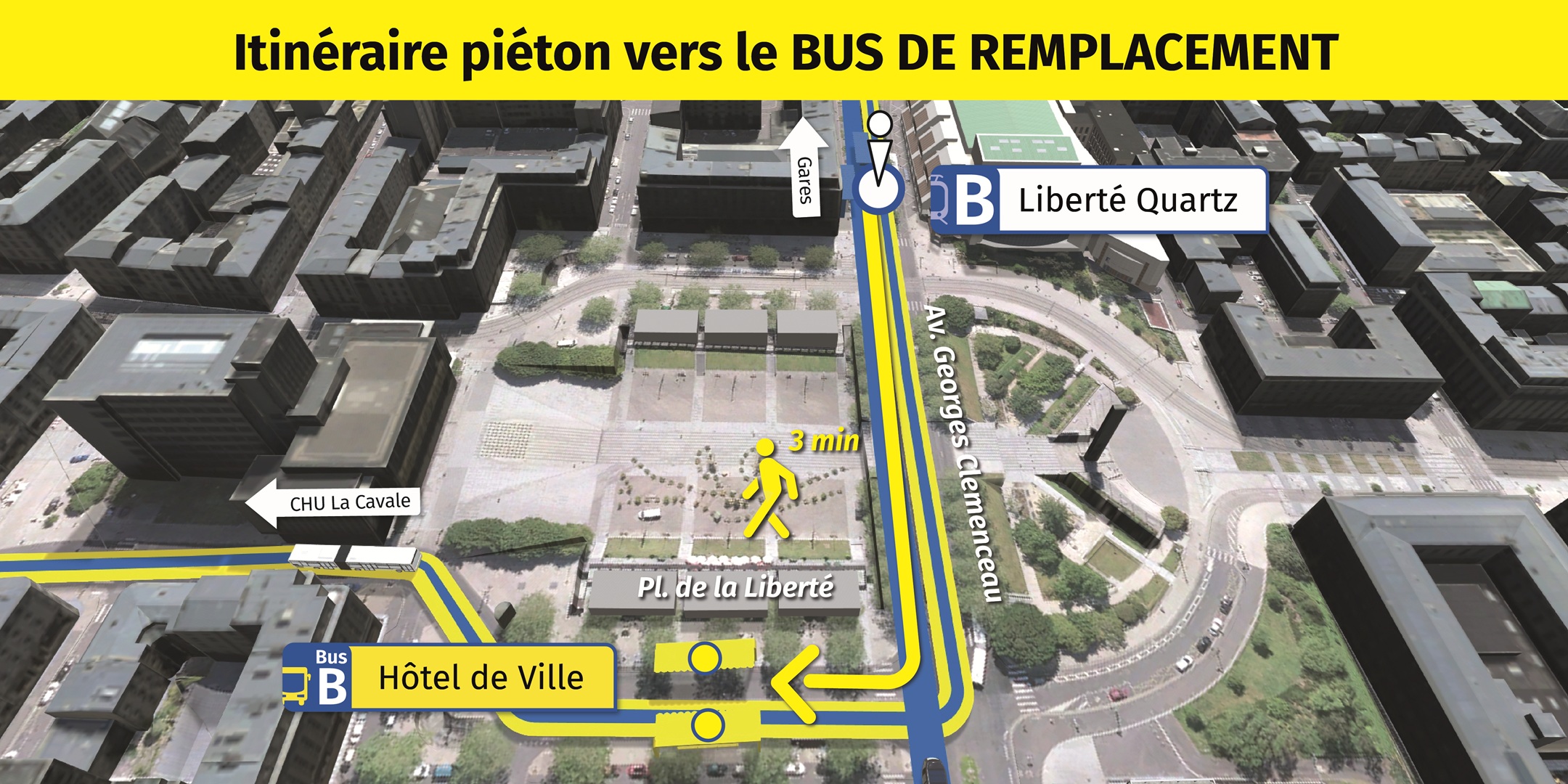 Les arrêts de bus de remplacement "Hôtel de Ville" sont situés à proximité de la Place de la Liberté, à 3 minutes de marche de la station de tramway "Liberté Quartz".