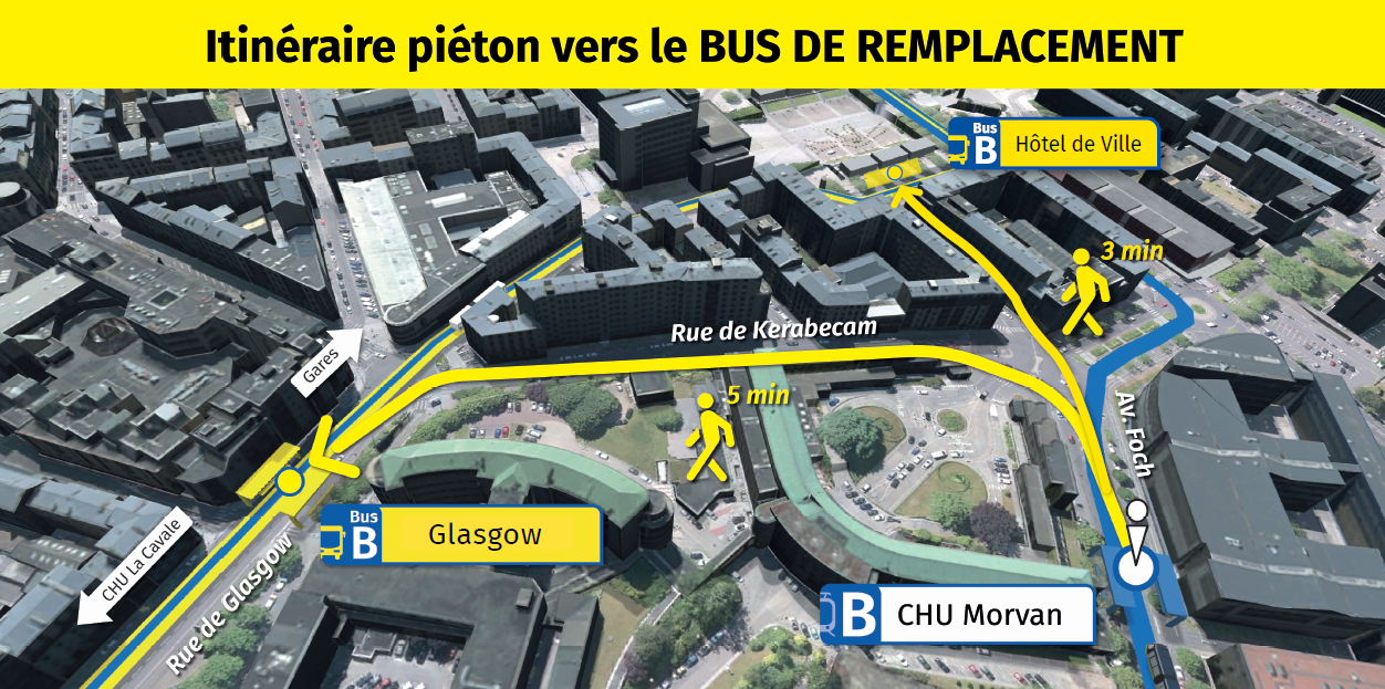 Les arrêts de bus de remplacement "Hôtel de Ville" sont situés sont situés à proximité de la Place de la Liberté à 3 minutes de marche de la station de tramway "CHU Morvan". Les arrêts de bus de remplacement "Glasgow" sont situés Rue de Glasgow, à 5 minutes de marche de la station de tramway "CHU Morvan".
