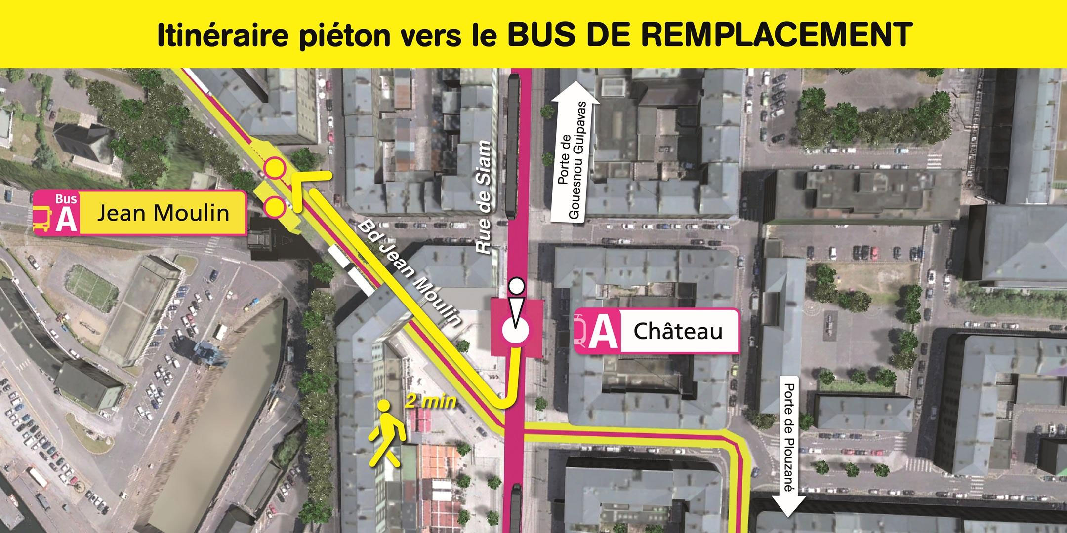 Les arrêts de bus de remplacement "Jean Moulin" sont situés boulevard Jean Moulin, à 2 minutes de marche de la station de tramway "Château".