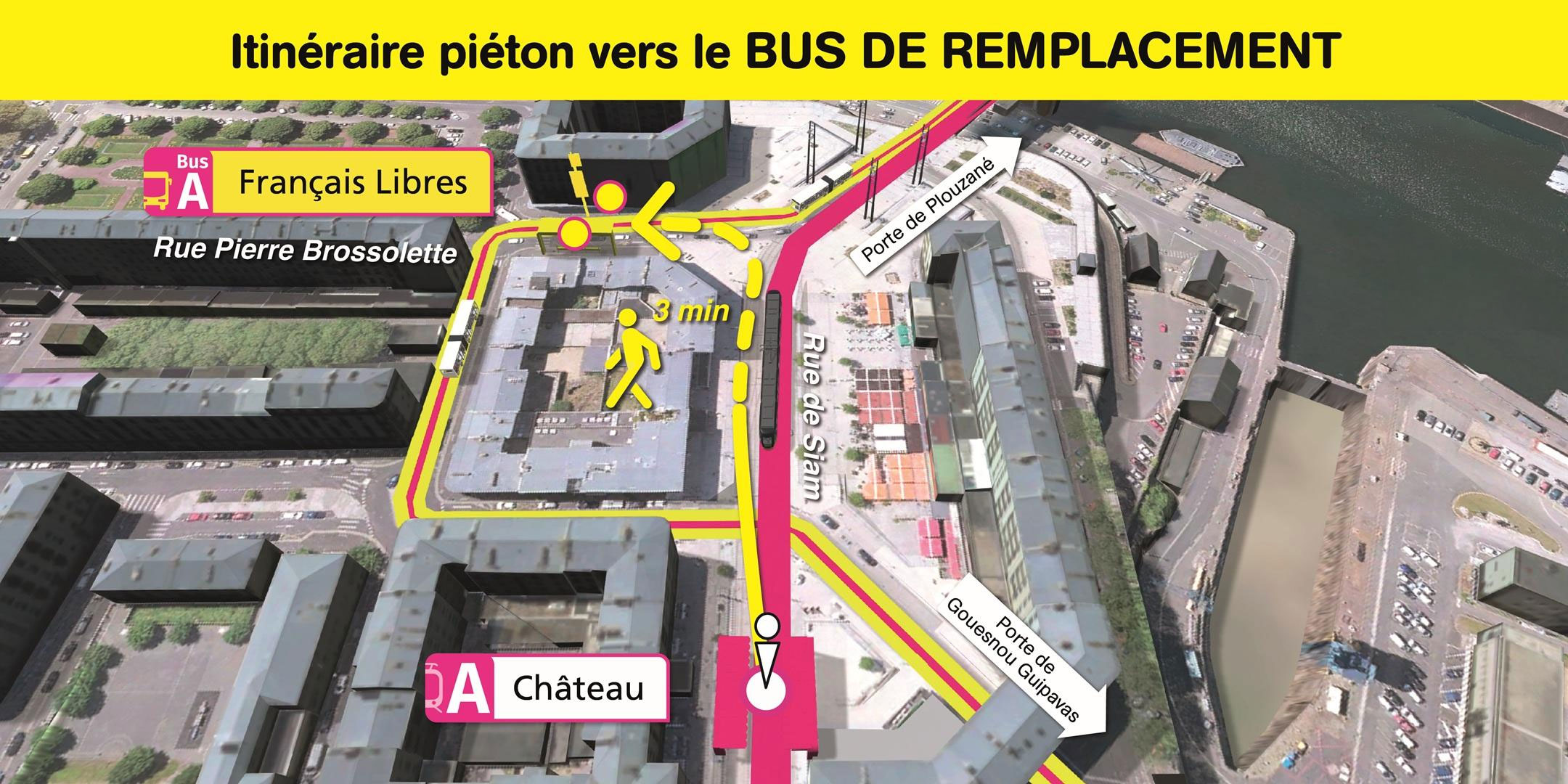 Les arrêts de bus de remplacement "Français Libres" sont situés rue Pierre Brossolette, à 2 minutes de marche de la station de tramway "Château".