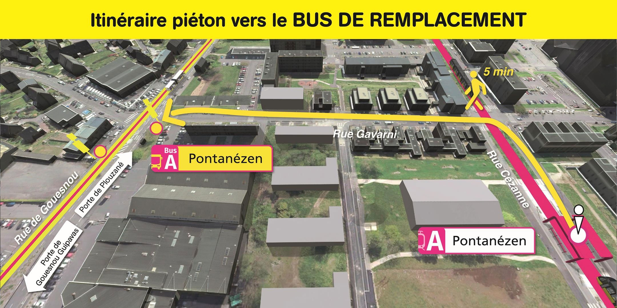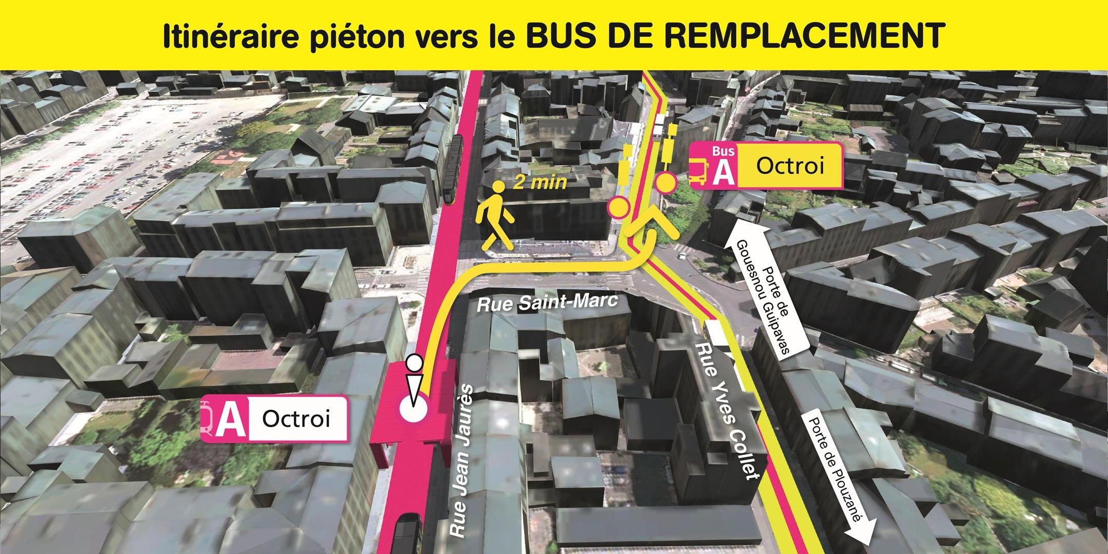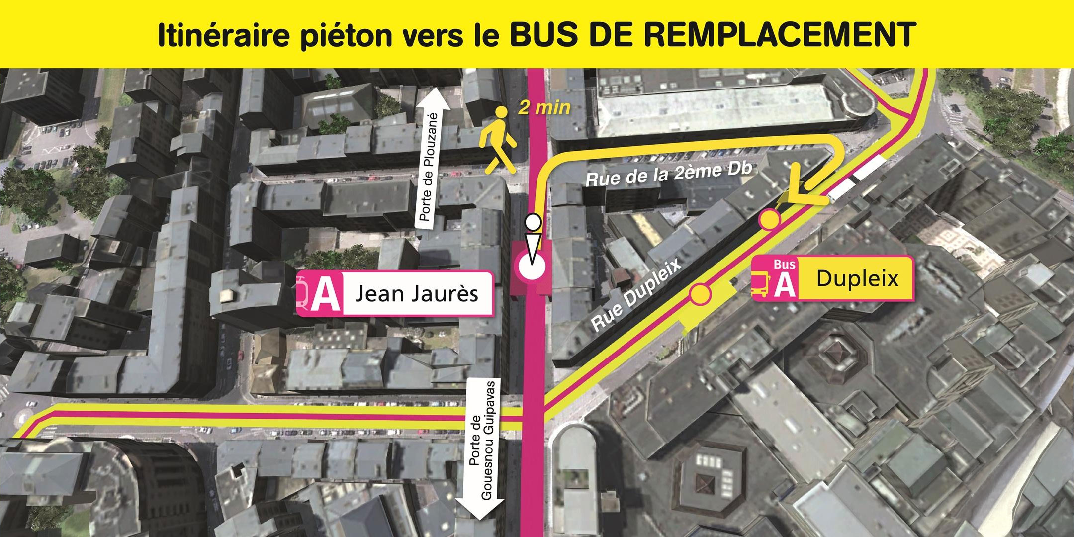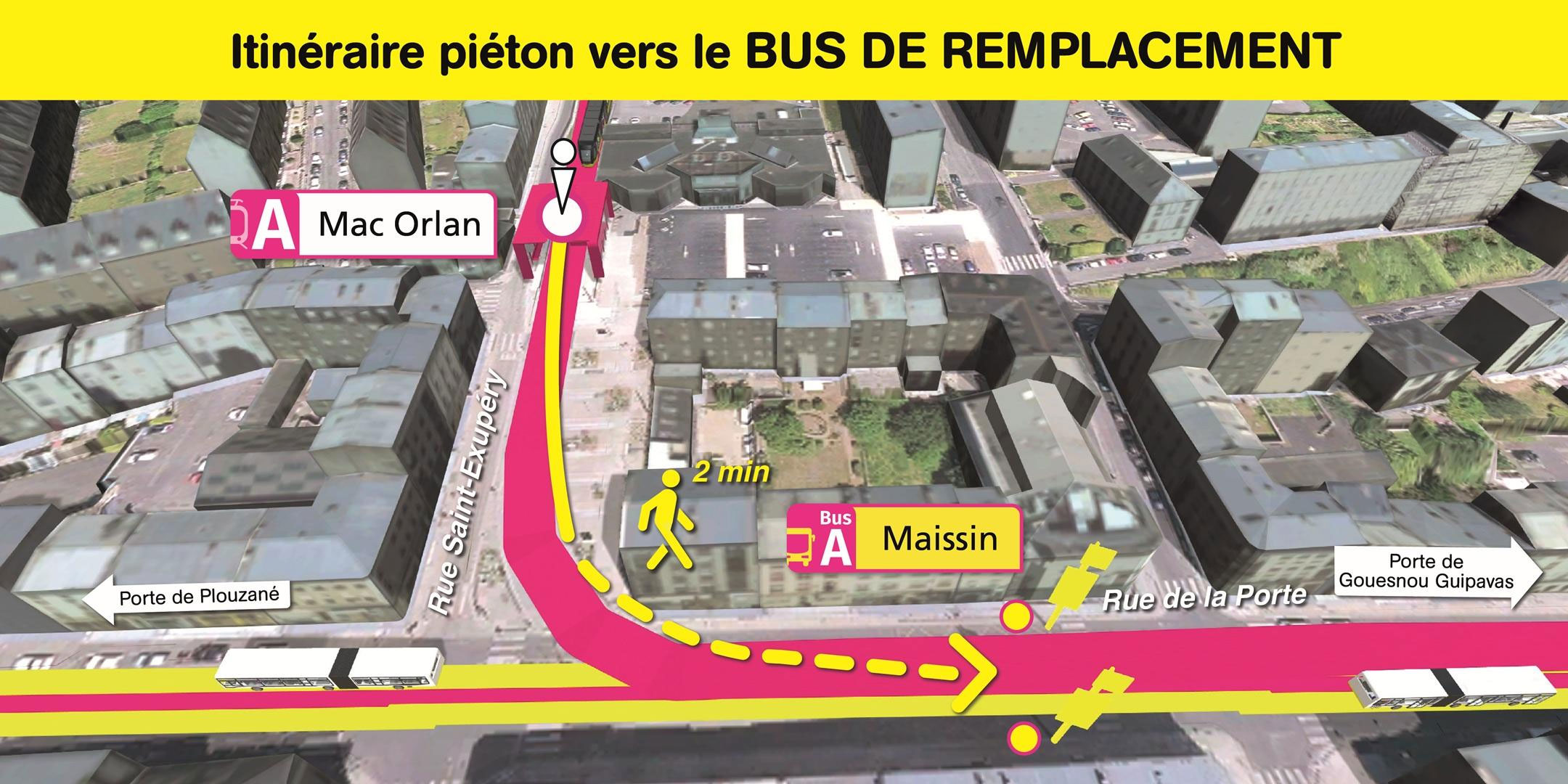 Visualisez ci-dessous, l'emplacement des arrêts de bus de remplacement et le cheminement piéton pour vous y rendre.