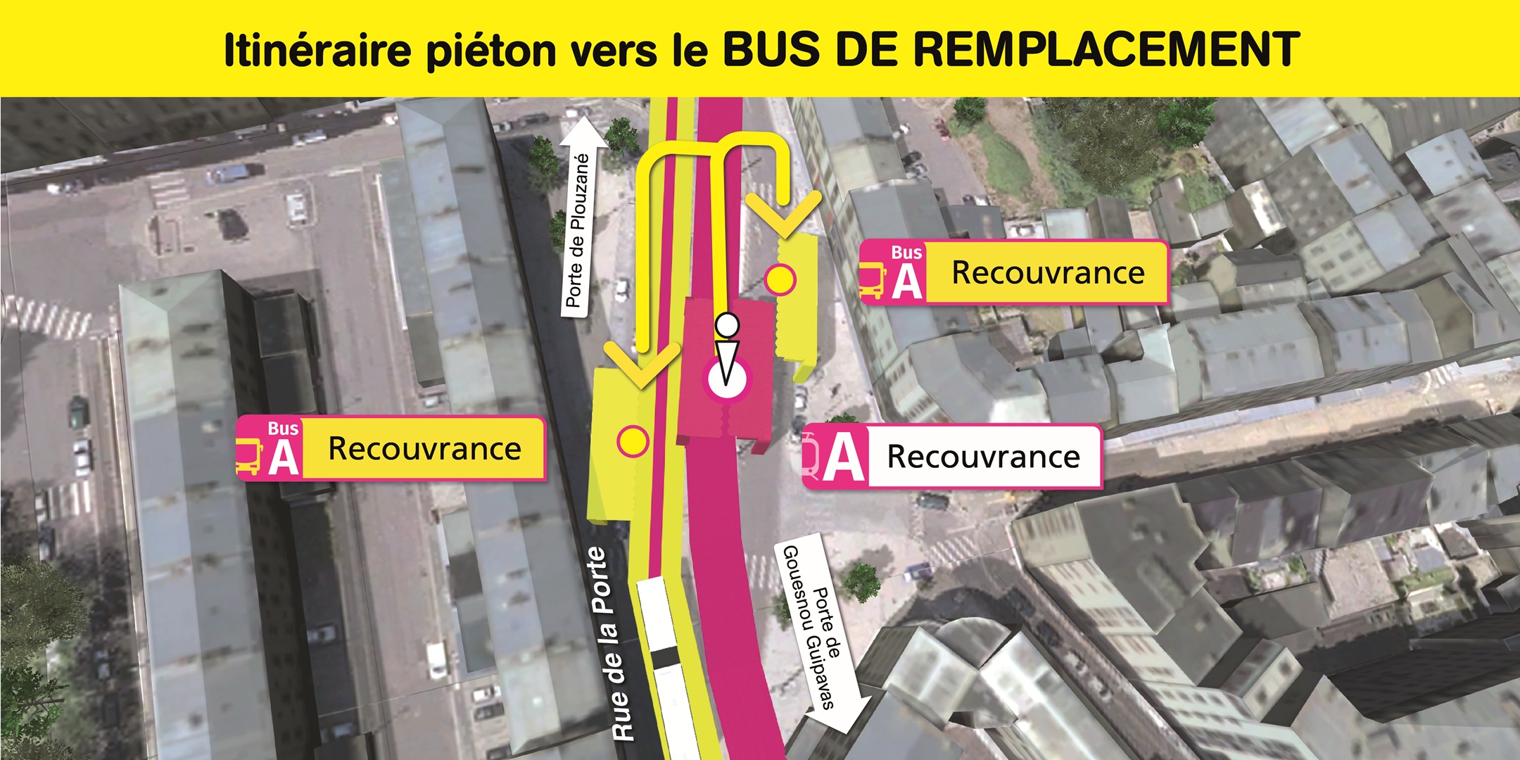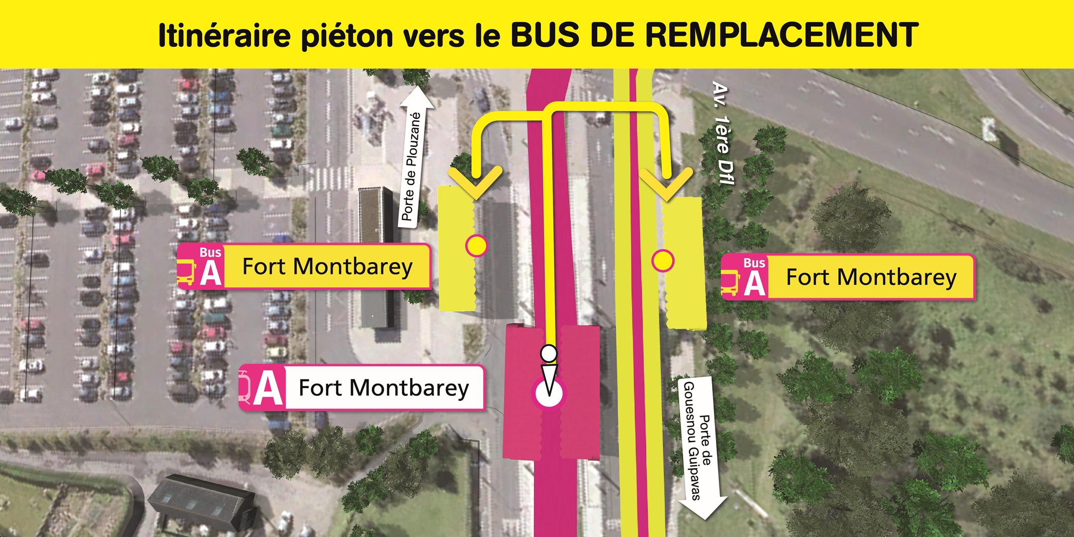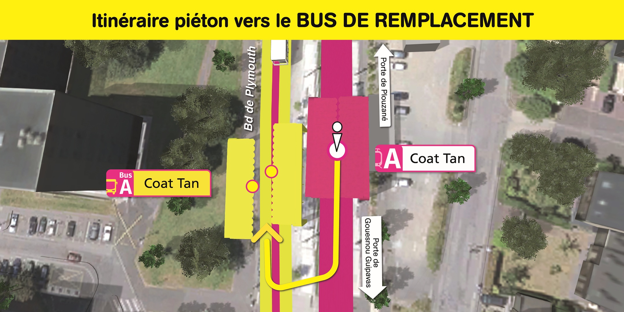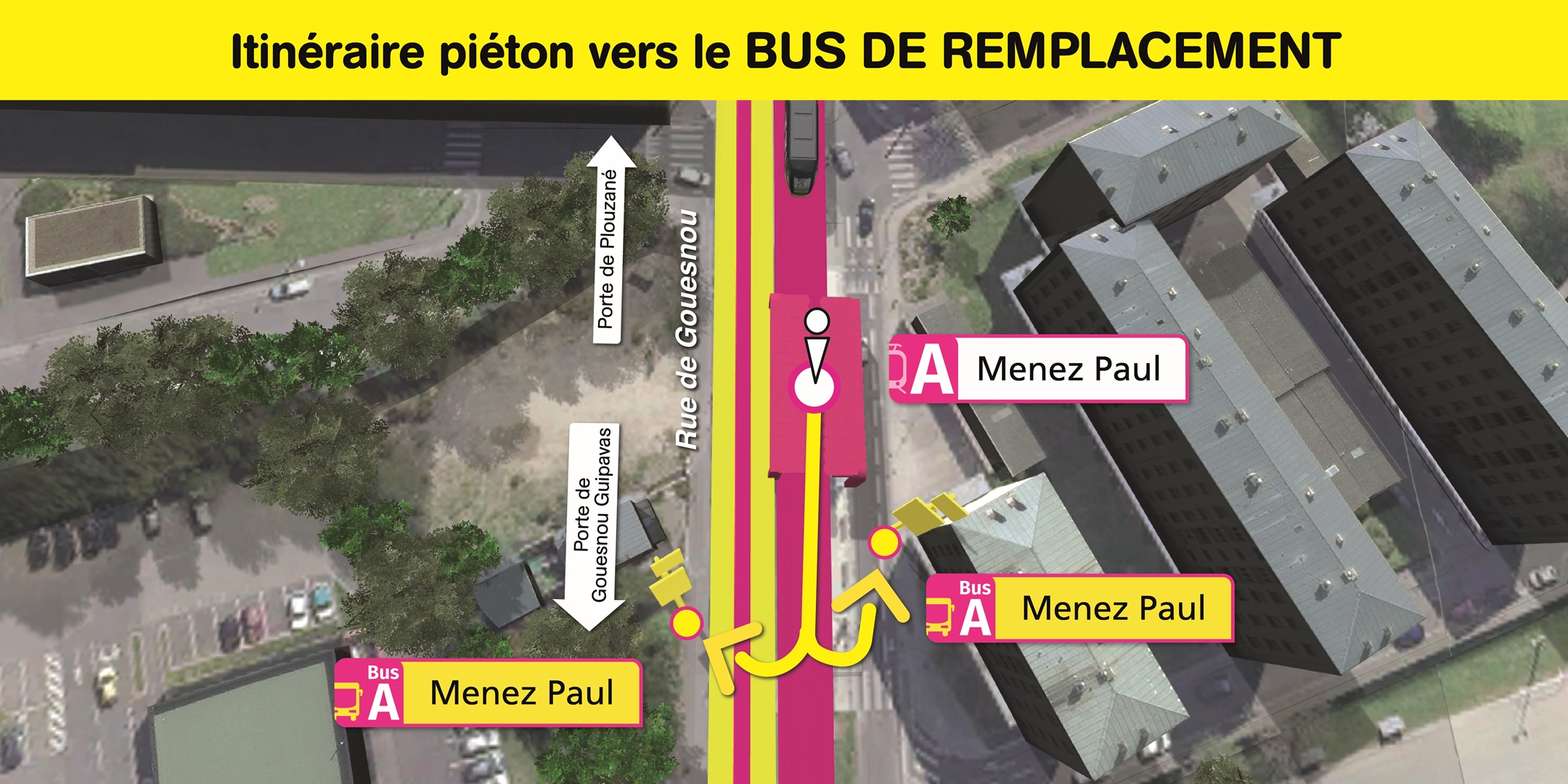 Visualisez ci-dessous, l'emplacement des arrêts de bus de remplacement et le cheminement piéton pour vous y rendre.