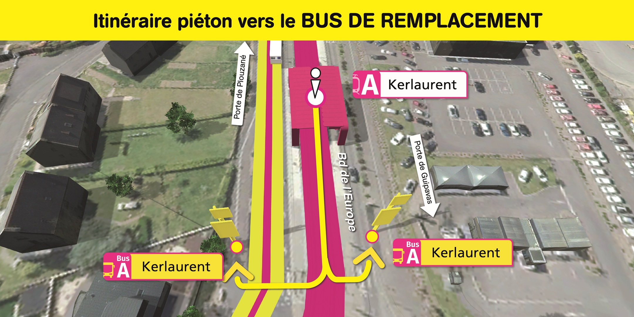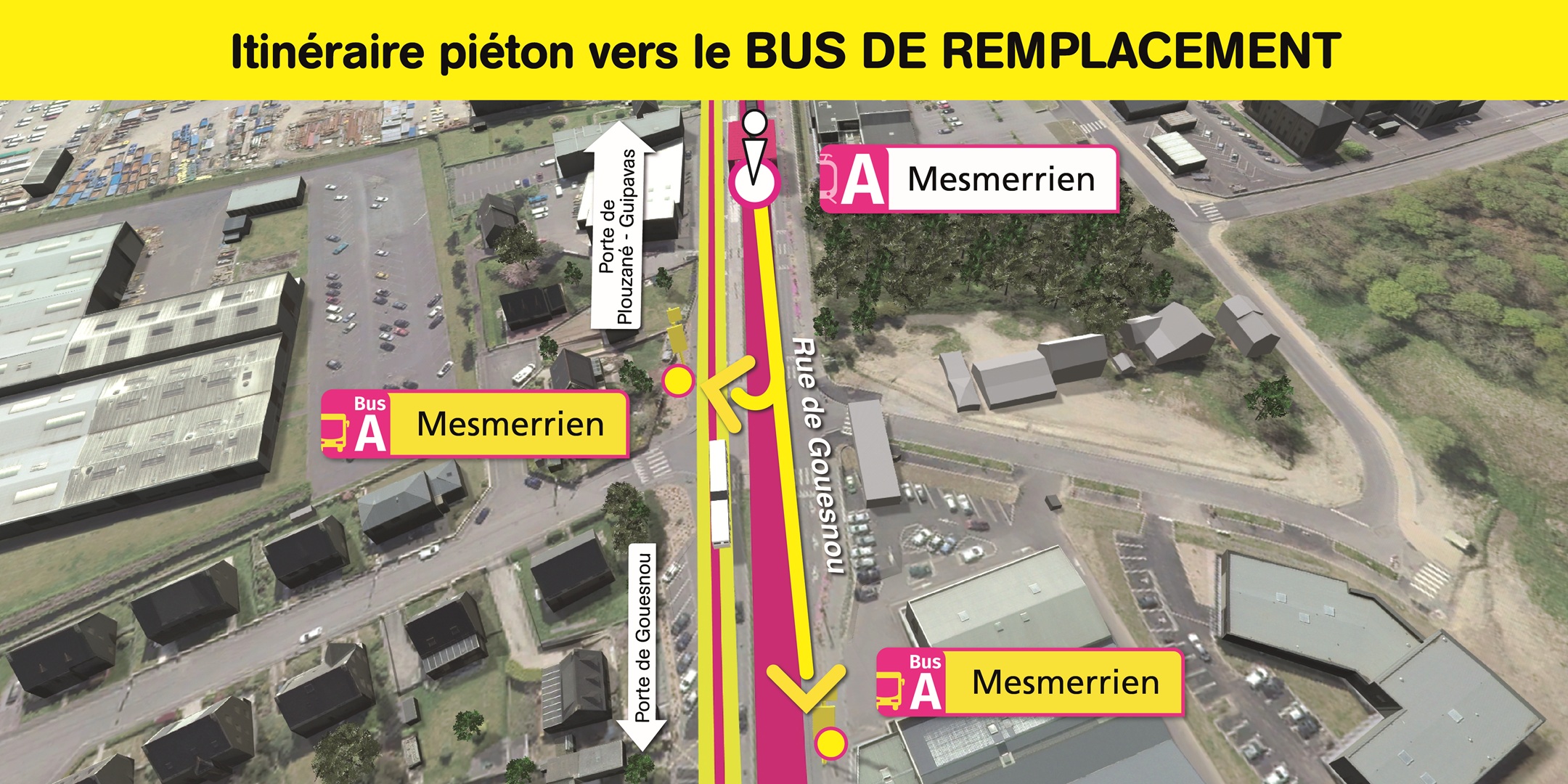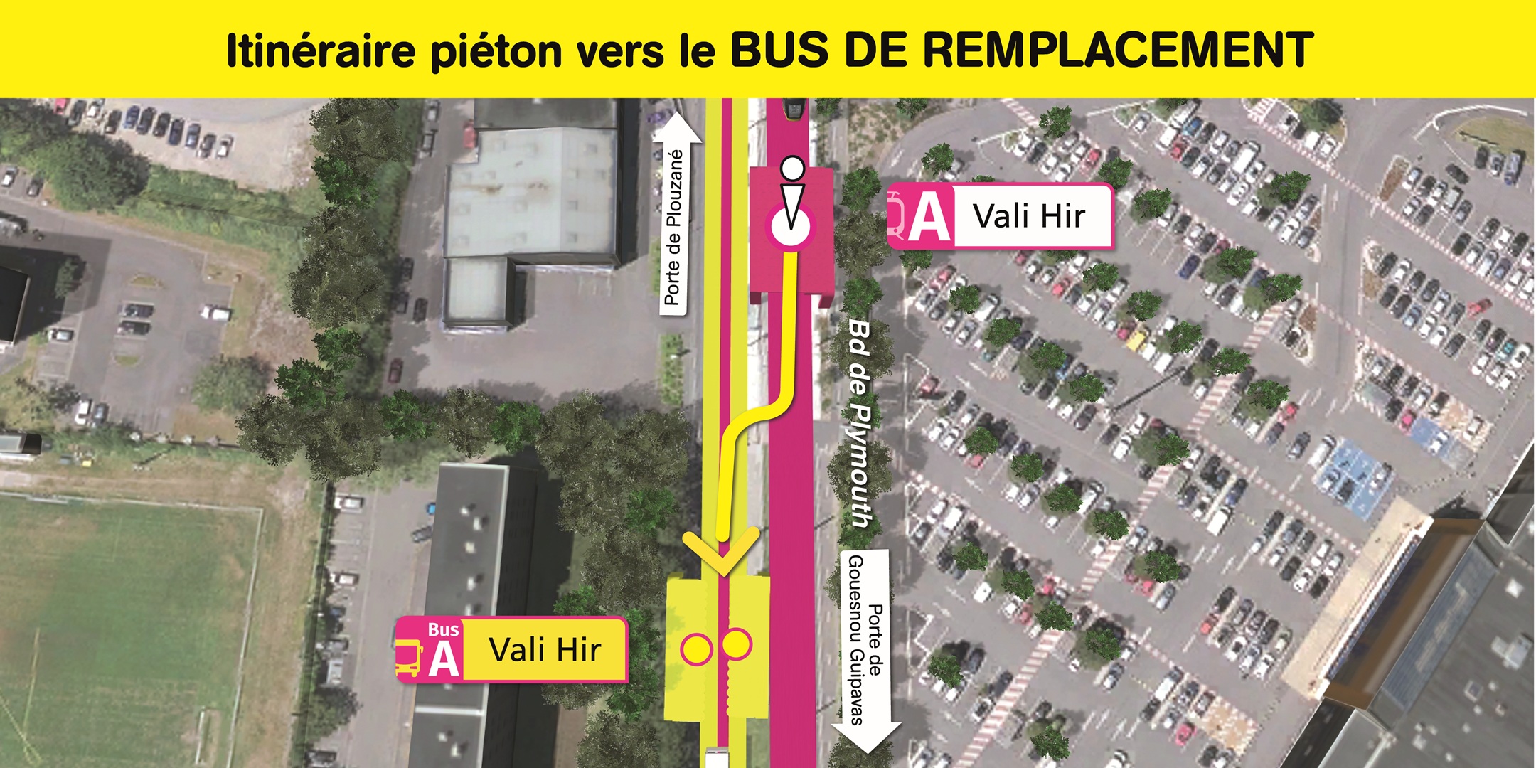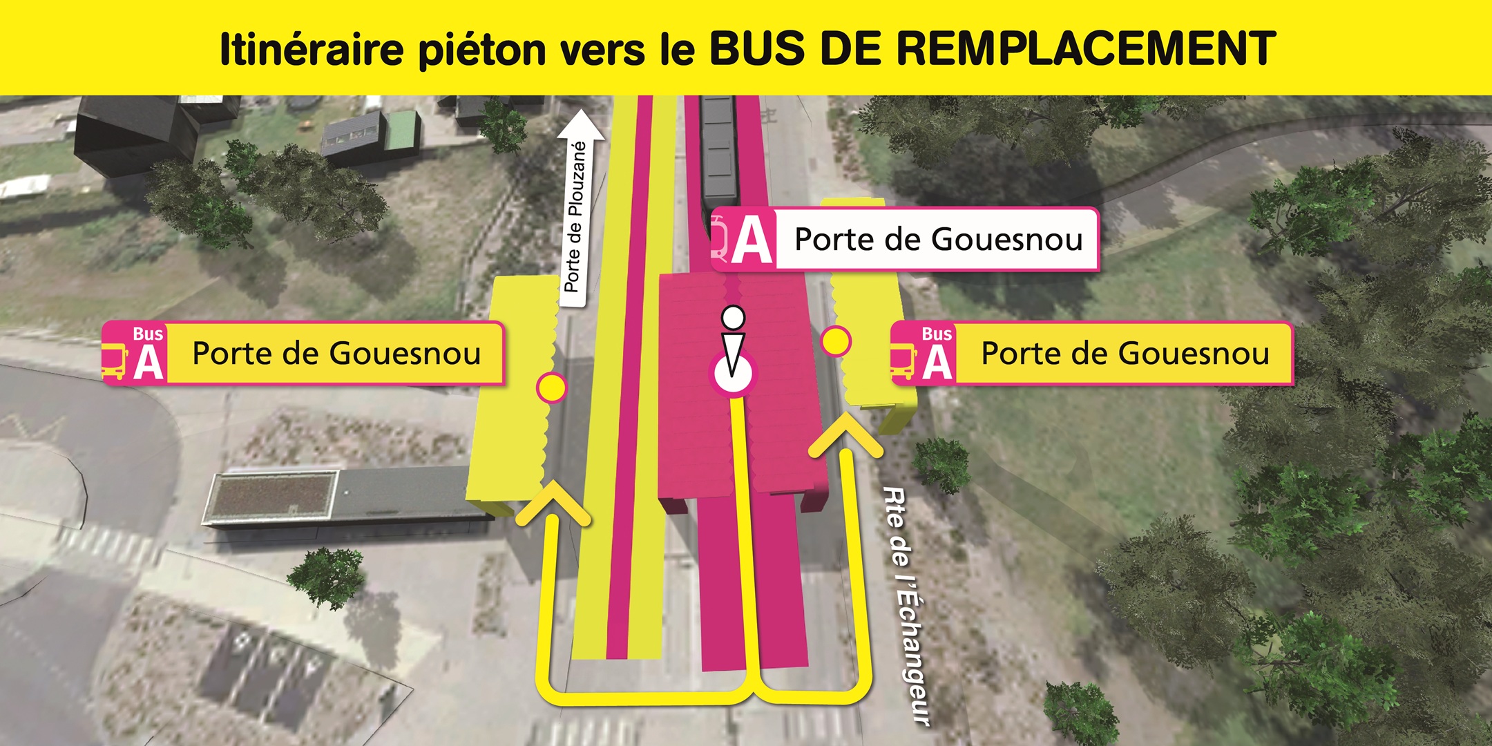 Visualisez ci-dessous, l'emplacement des arrêts de bus de remplacement et le cheminement piéton pour vous y rendre.