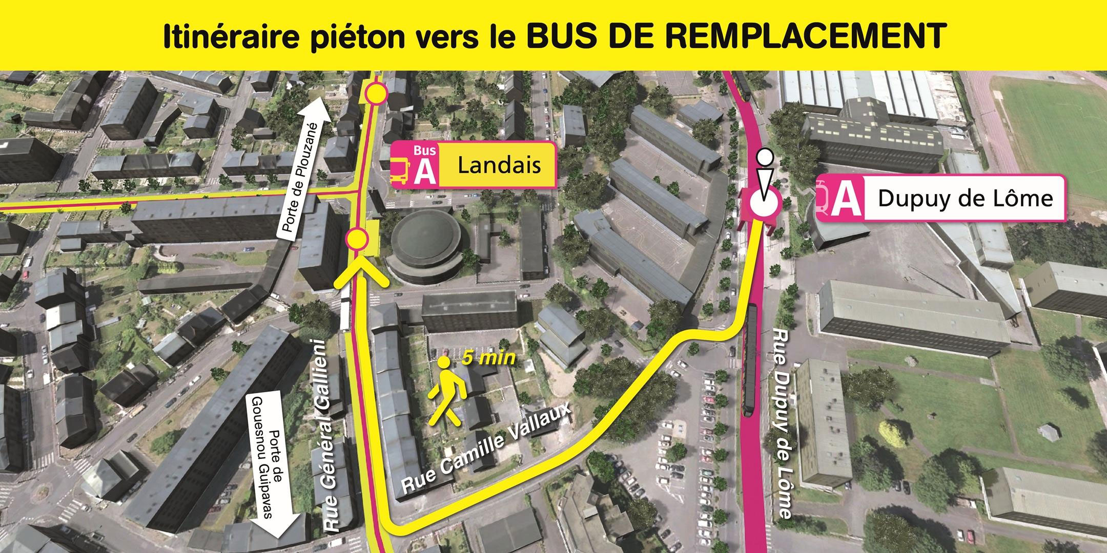 Les arrêts de bus de remplacement "Landais" sont situés rue Général Gallieni, à 5 minutes de marche de la station de tramway "Dupuy de Lôme".