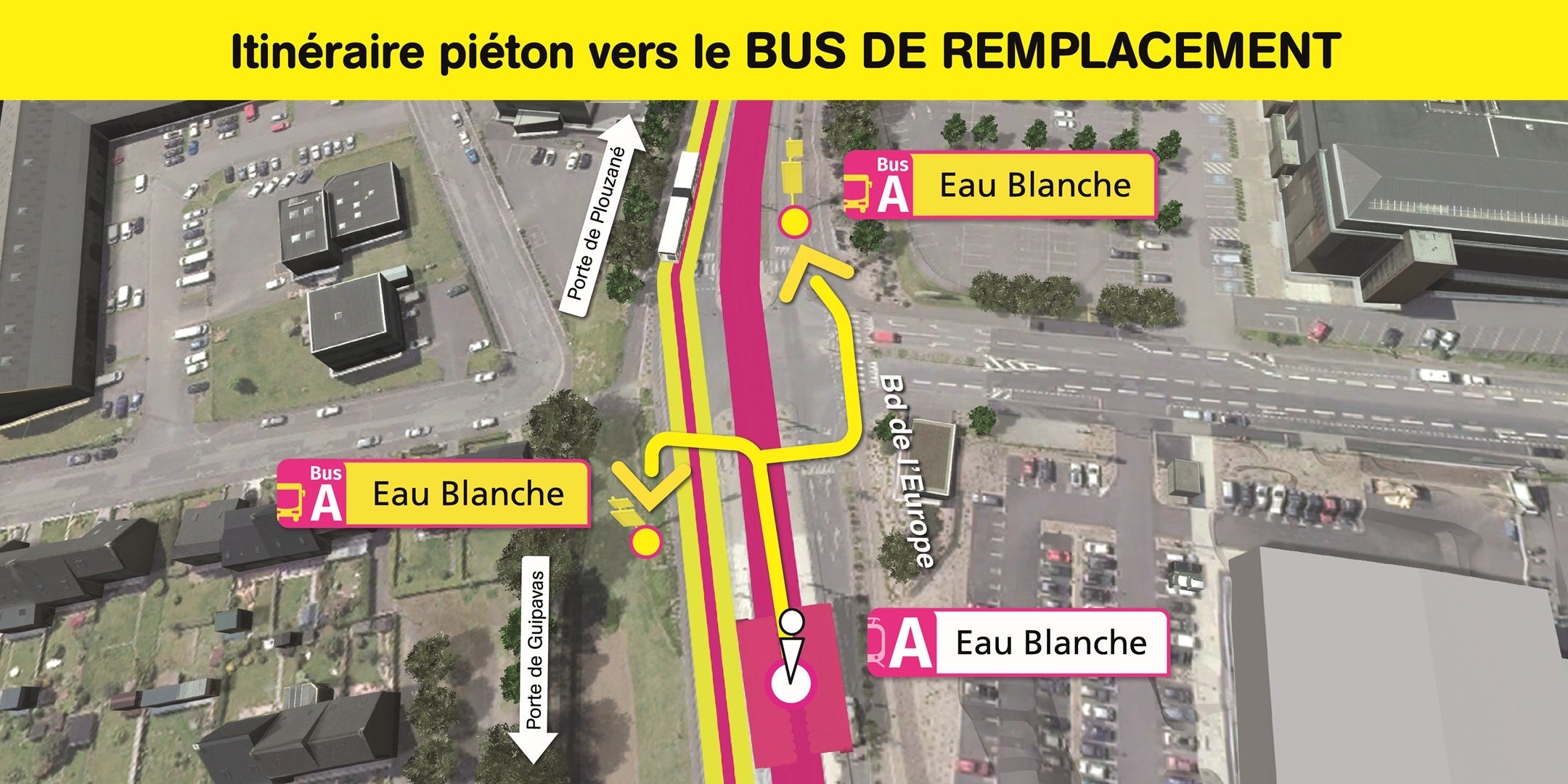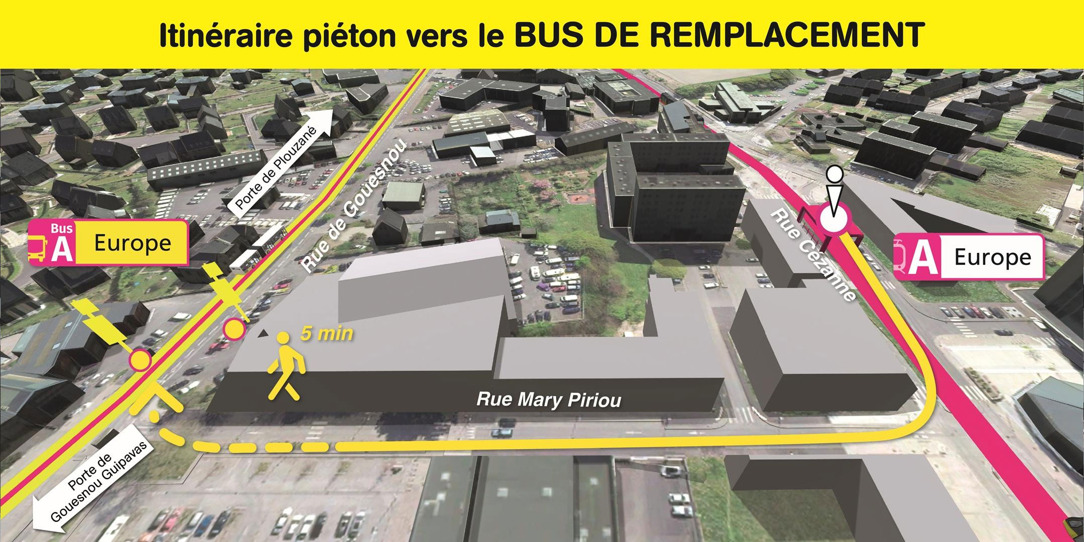 Les arrêts de bus de remplacement "Europe" sont situés rue de Gouesnou, à 5 minutes de marche de la station de tramway "Europe".