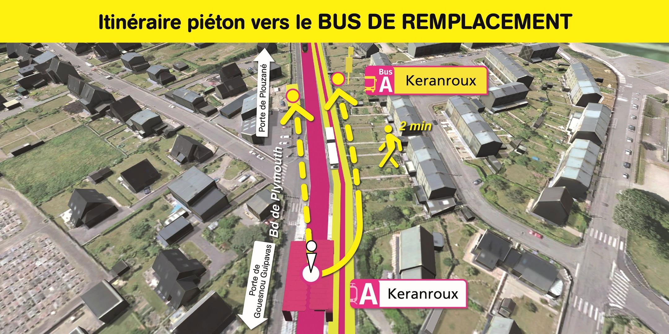 Les arrêts de bus de remplacement "Keranroux" sont situés boulevard de Plymouth, à 2 minutes de marche de la station de tramway "Keranroux".