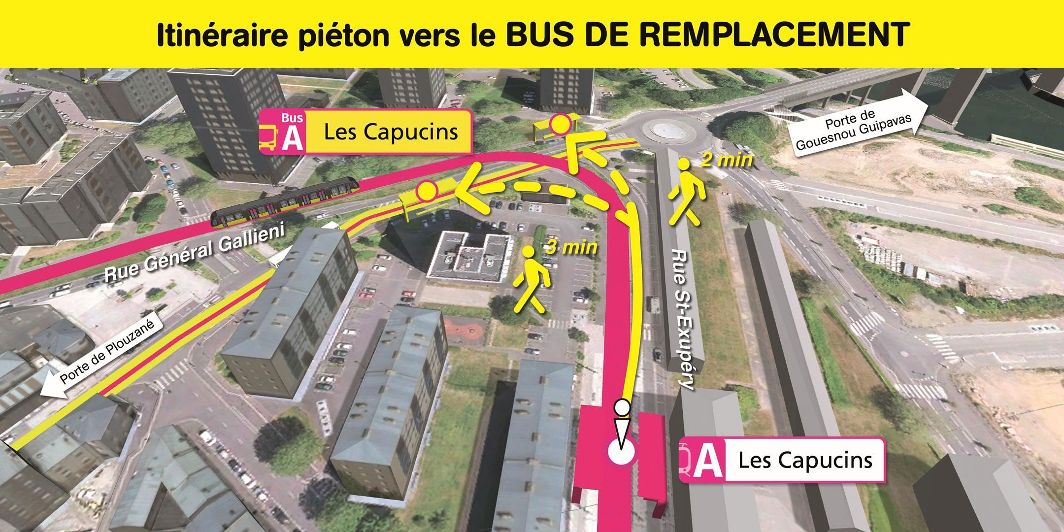 Les arrêts de bus de remplacement "Les Capucins" sont situés rue Général Gallieni, à 2 minutes de marche de la station de tramway "Les Capucins".