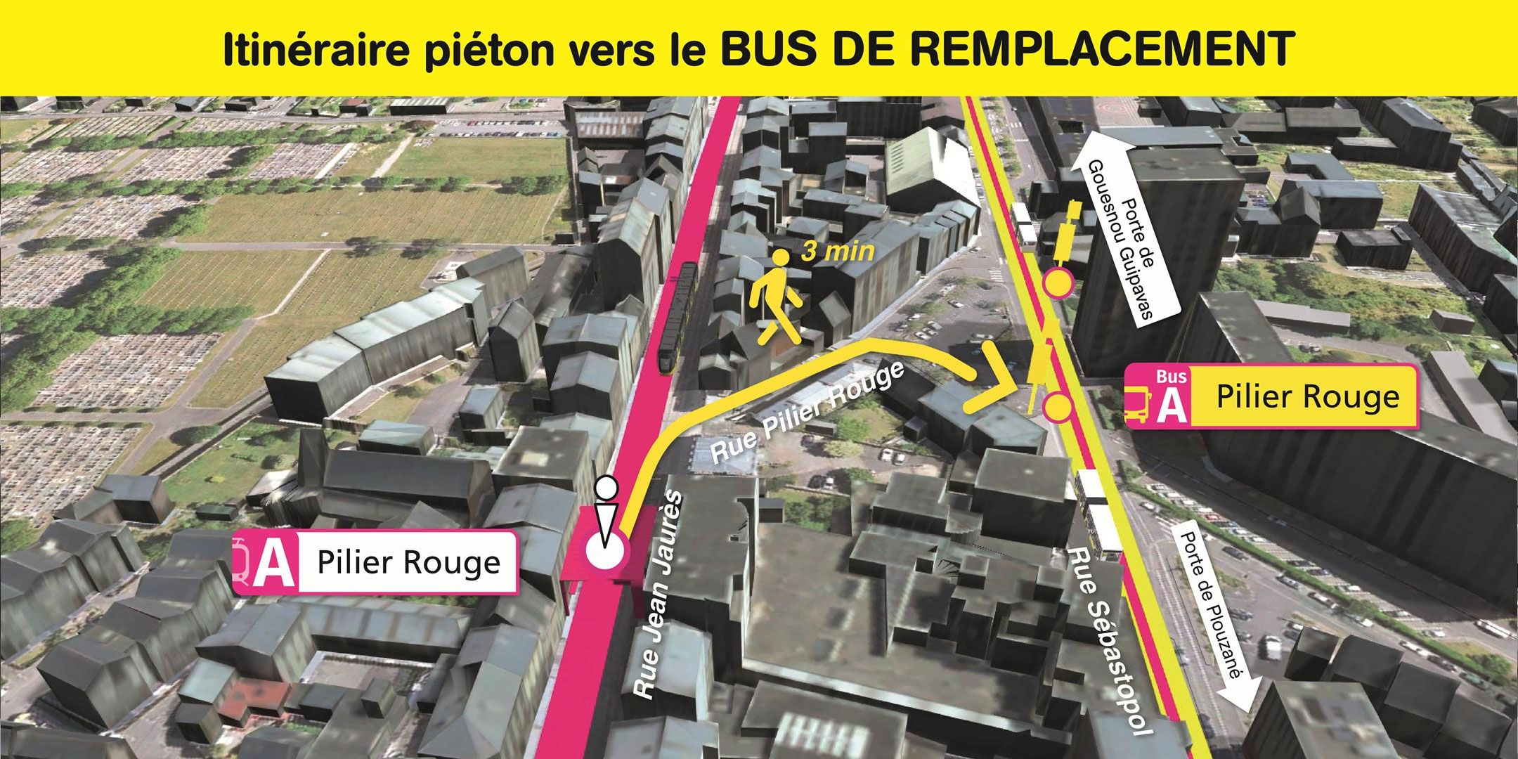 Les arrêts de bus de remplacement "Pilier Rouge" sont situés rue Sébastopol, à 3 minutes de marche de la station de tramway "Pilier Rouge".
