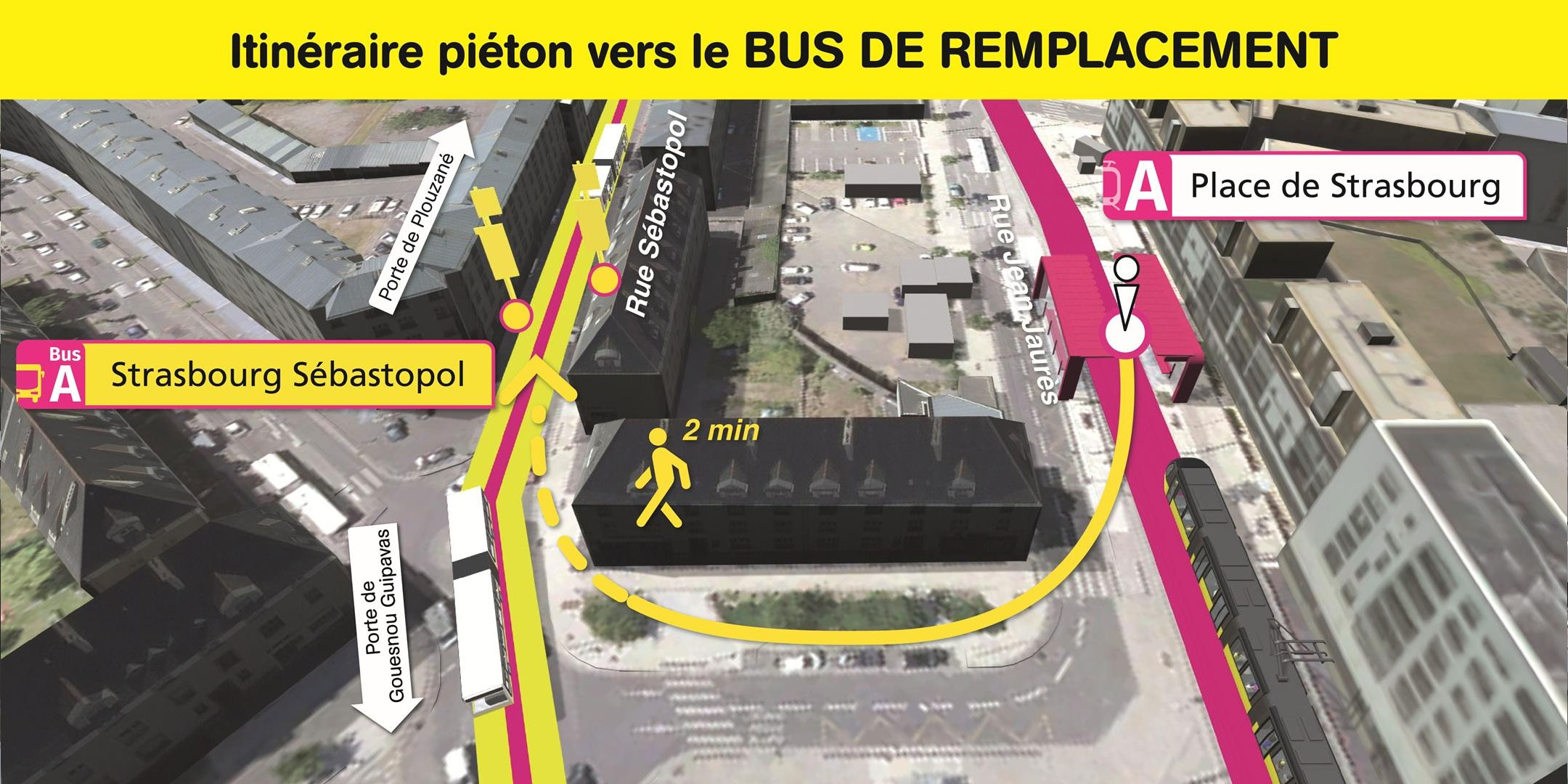 Les arrêts de bus de remplacement "Strasbourg Sébastopol" sont situés rue Sébastopol, à 2 minutes de marche de la station de tramway "Place de Strasbourg".