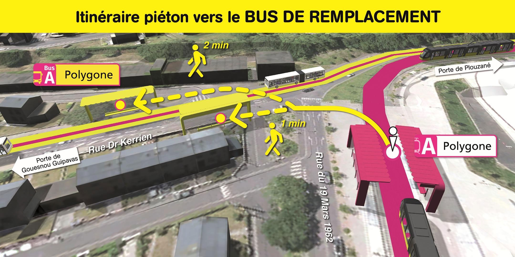 Les arrêts de bus de remplacement "Polygone" sont situés rue Docteur Kerrien, à 1 et 2 minutes de marche de la station de tramway "Polygone".