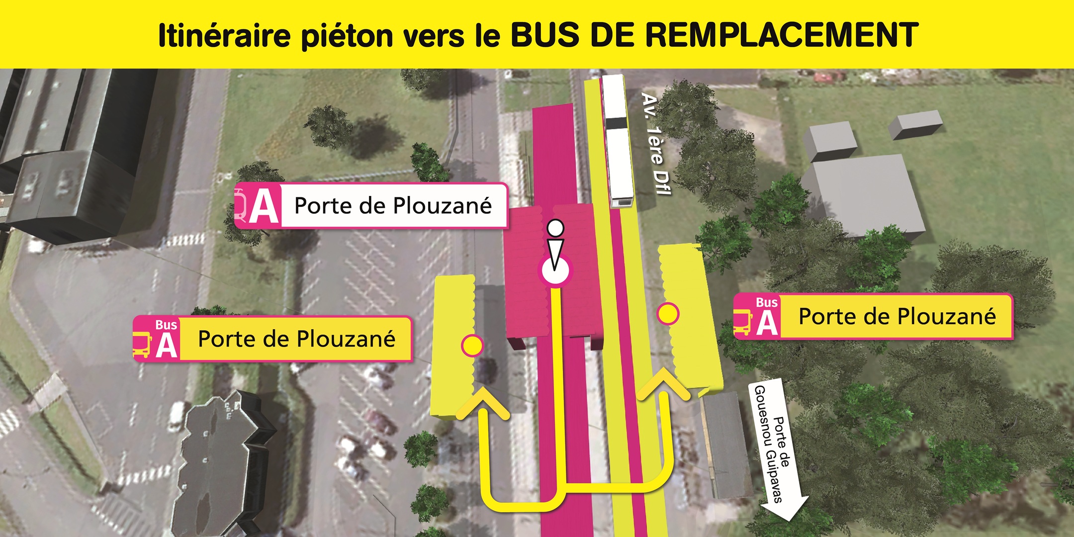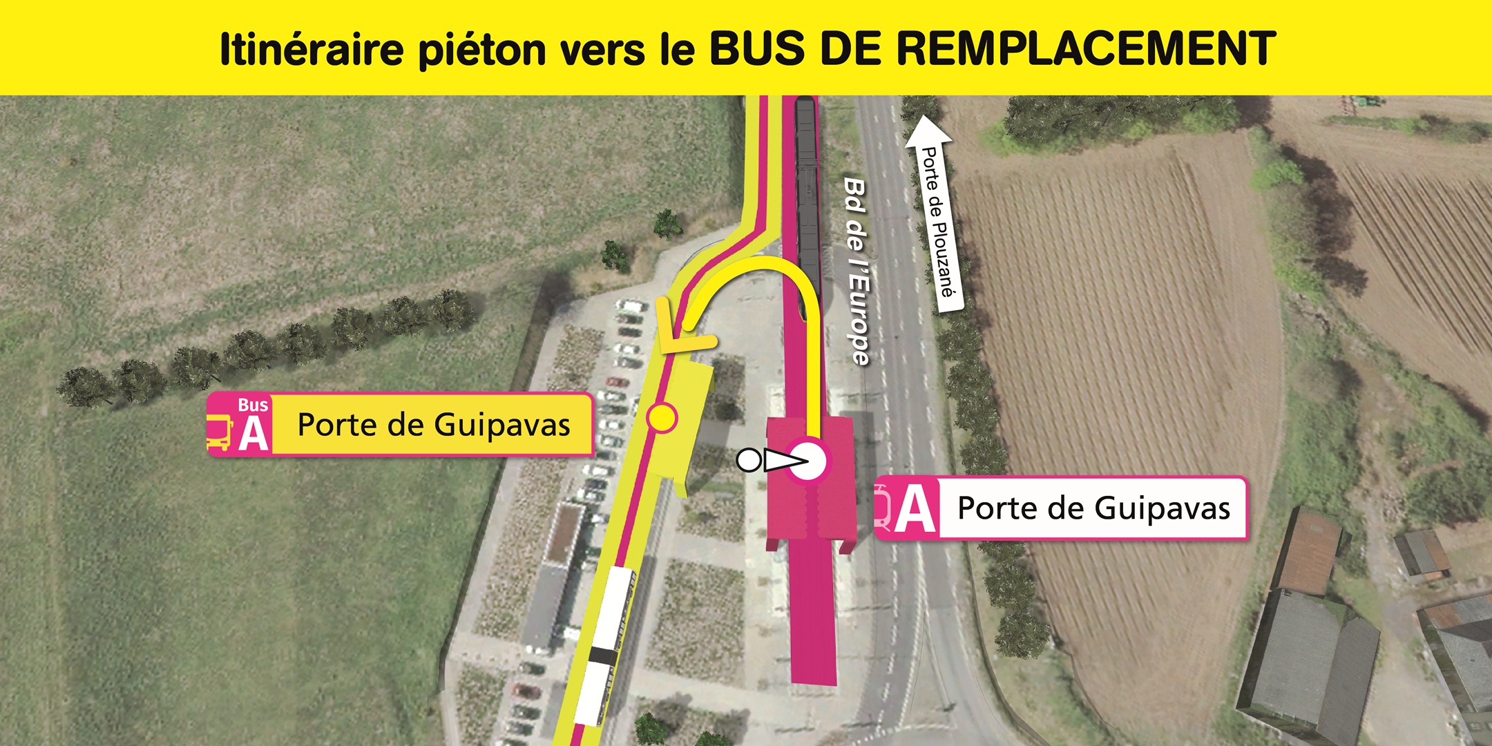 Les arrêts de bus de remplacement "Porte de Guipavas" sont situés à proximité immédiate de la station de tramway "Porte de Guipavas".