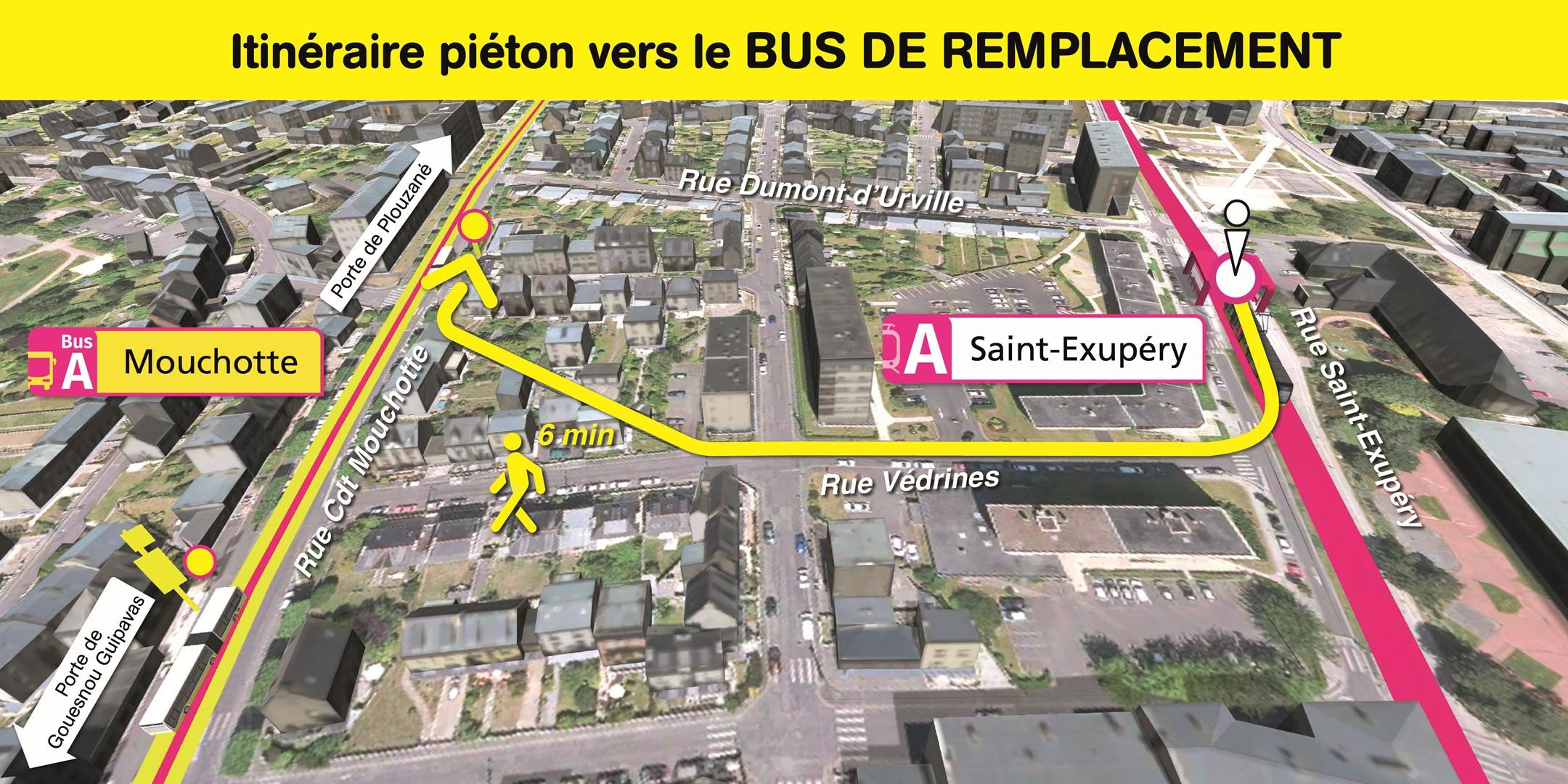 Les arrêts de bus de remplacement "Mouchotte" sont situés rue Commandant Mouchotte, à 5 et 6 minutes de marche de la station de tramway "Saint-Exupéry".