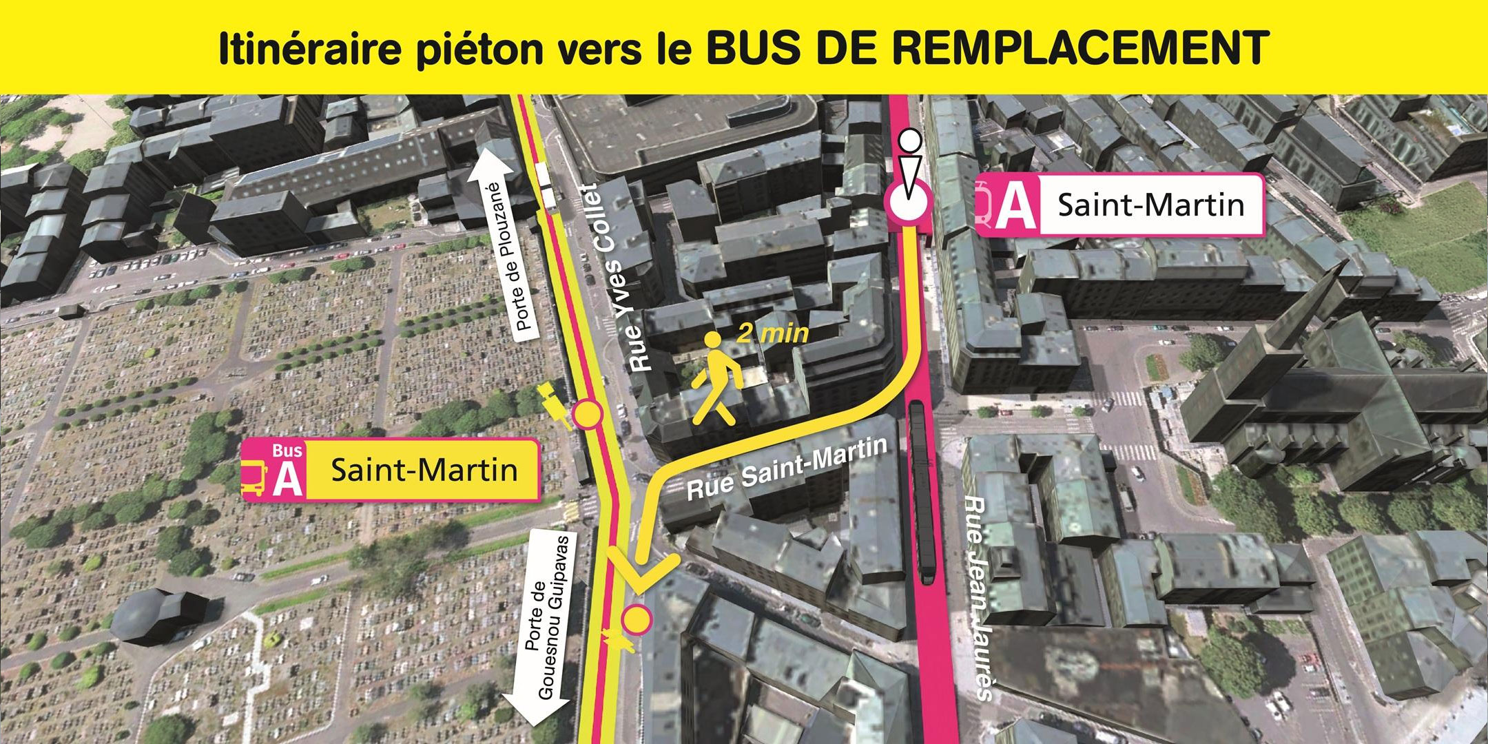 Les arrêts de bus de remplacement "Saint-Martin" sont situés rue Yves Collet, à 2 minutes de marche de la station de tramway "Saint-Martin".