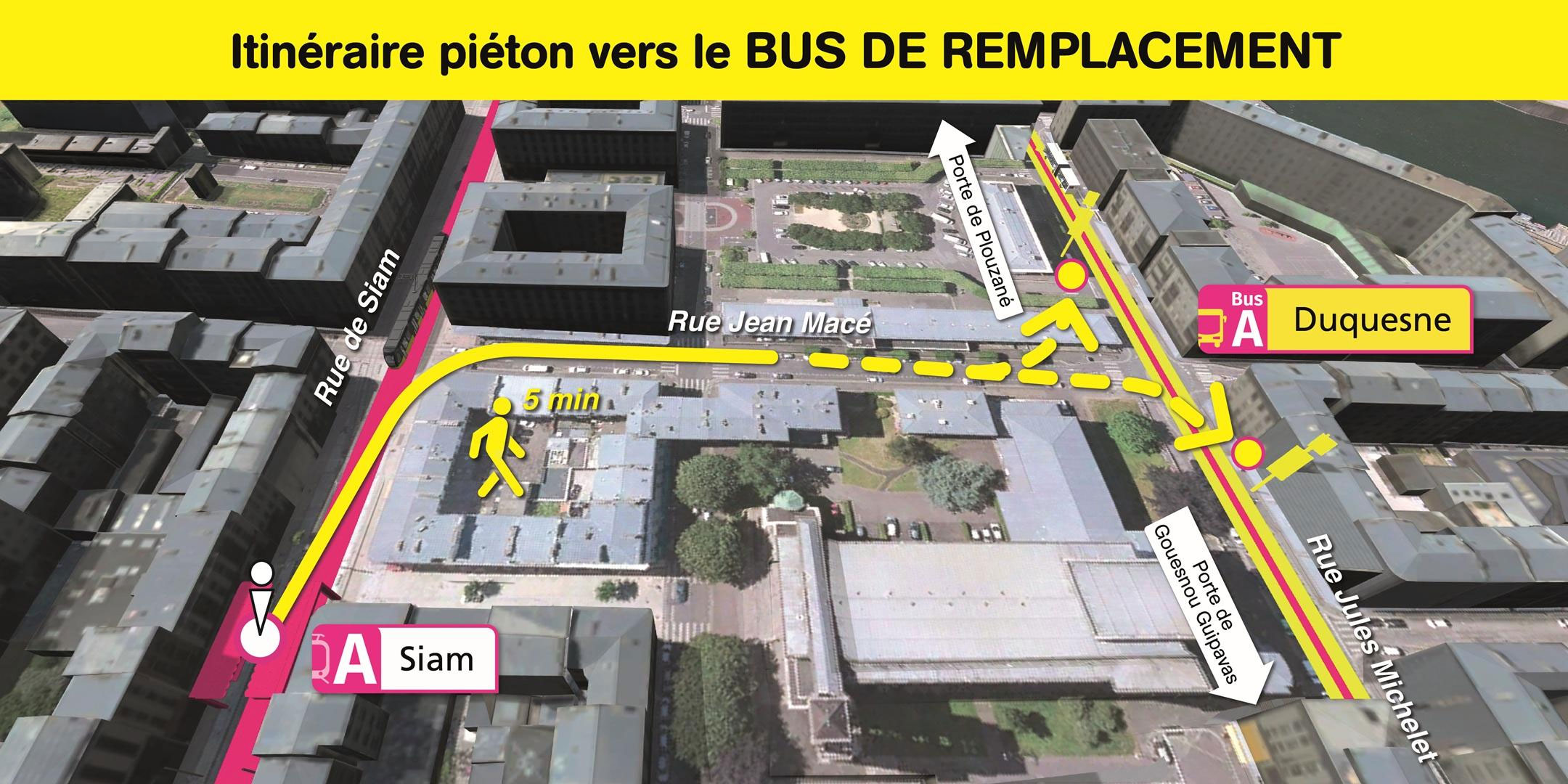 Les arrêts de bus de remplacement "Duquesne" sont situés rue Jules Michelet, à 2 minutes de marche de la station de tramway "Siam".