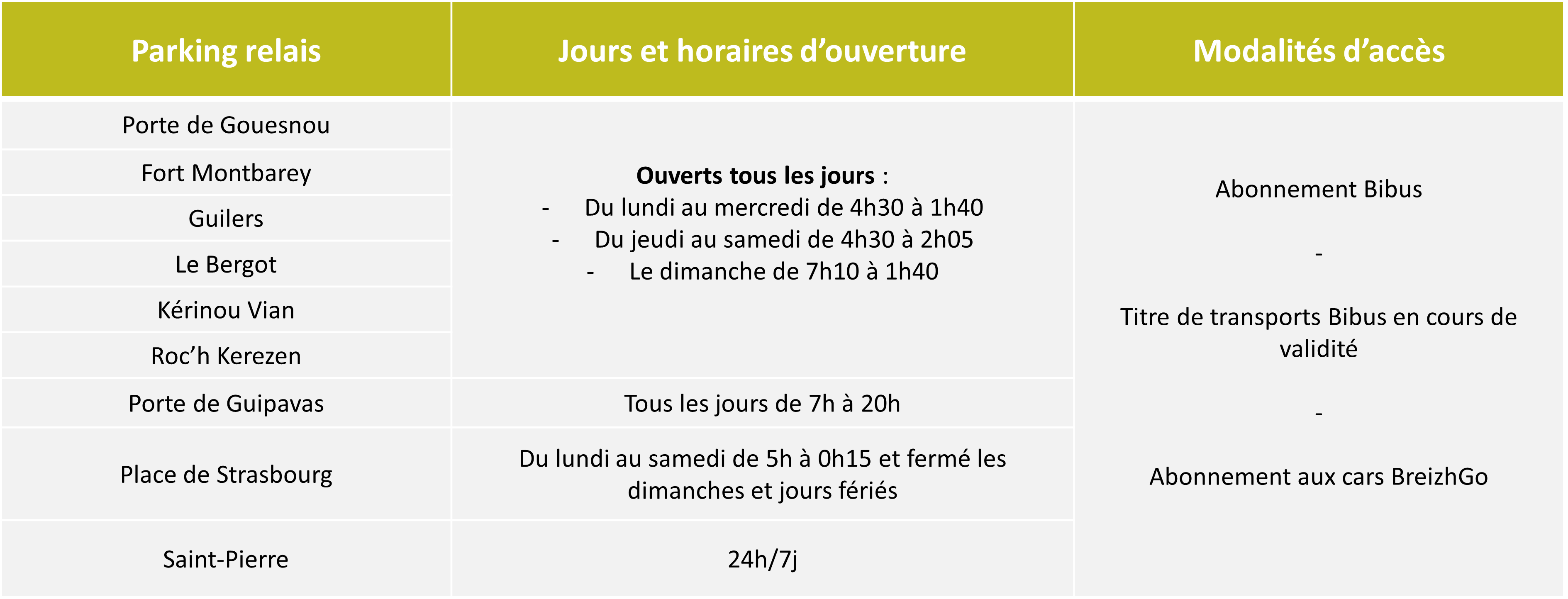 Actuellement, les parkings-relais de Kerinou Vian et du Bergot ont un nombre de places provisoirement réduit. À terme, ces deux parkings-relais disposeront respectivement de 170 et 140 places de stationnement.